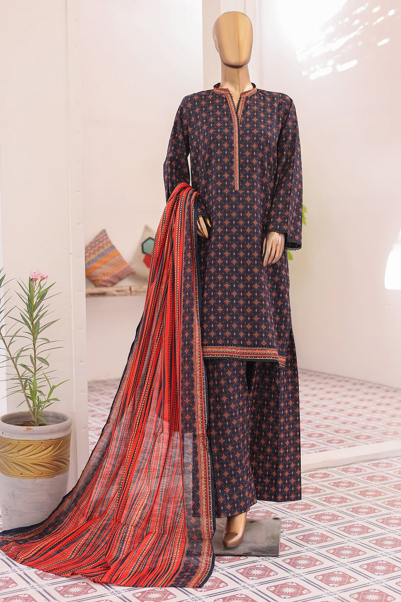 Lawn - Stitched printed 3piece with Farshi Shalwar - Dark Blue